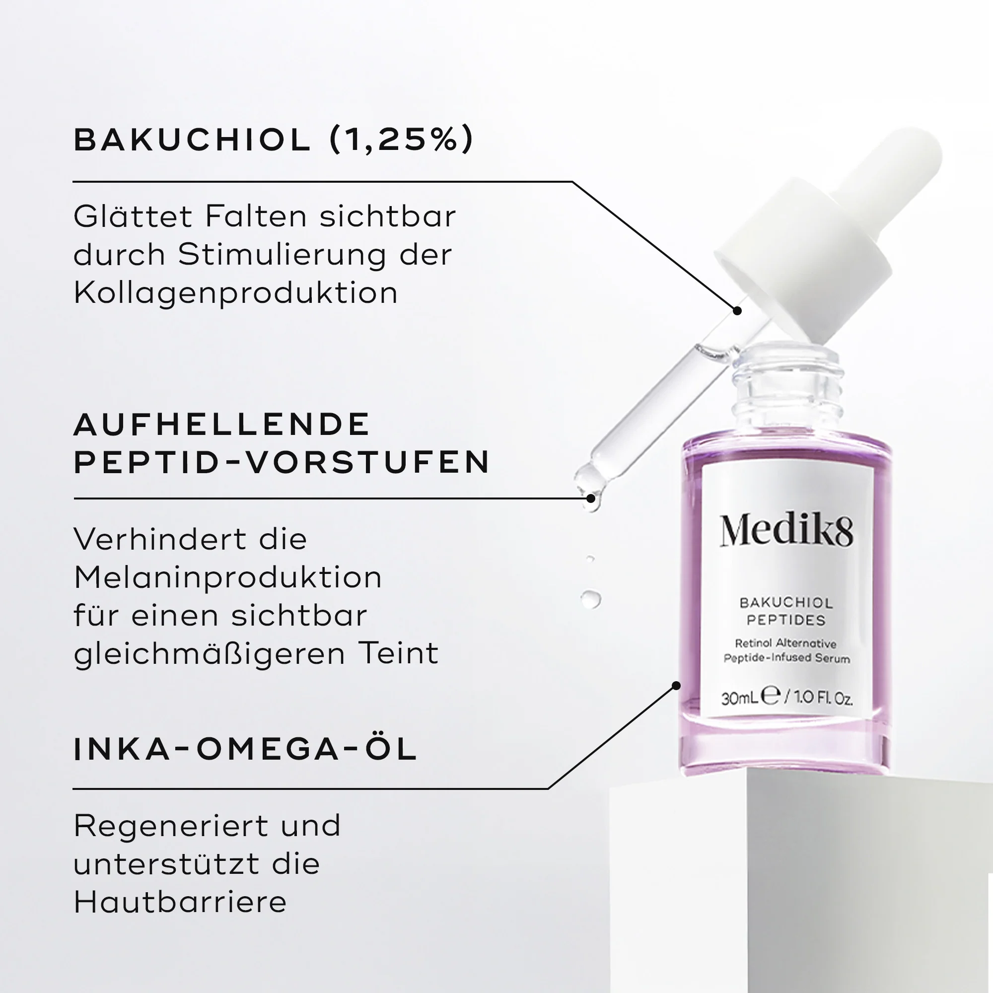 Mit der klinisch erprobten, aber sanften Kraft von 1,25 % Bakuchiol (ausgesprochen "Bak-oo-chi-ol") ist Bakuchiol Peptides die perfekte Alternative für alle, die kein Retinol verwenden dürfen (z. B. während der Schwangerschaft oder Stillzeit).
