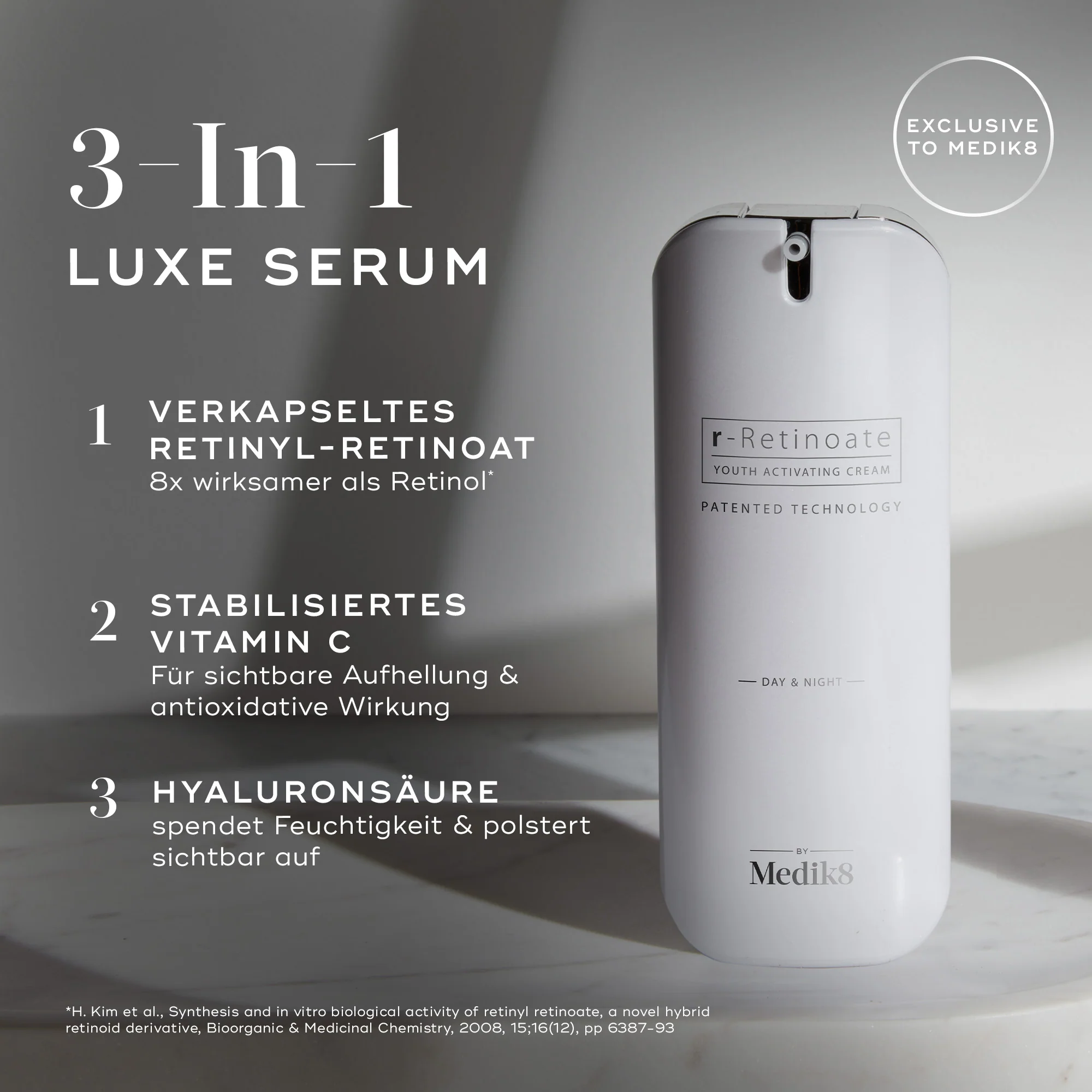 Dieses luxuriöse Serum enthält das exklusive, verkapselte Retinyl-Retinoat von Medik8, das nachweislich 8-mal wirksamer ist als herkömmliches Retinol* und der Hautalterung entgegenwirkt.